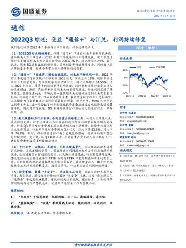 【国盛证券】【20221110】通信2022Q3综述:受益“通信+”与汇兑,利润持续修复-18页 行业研究