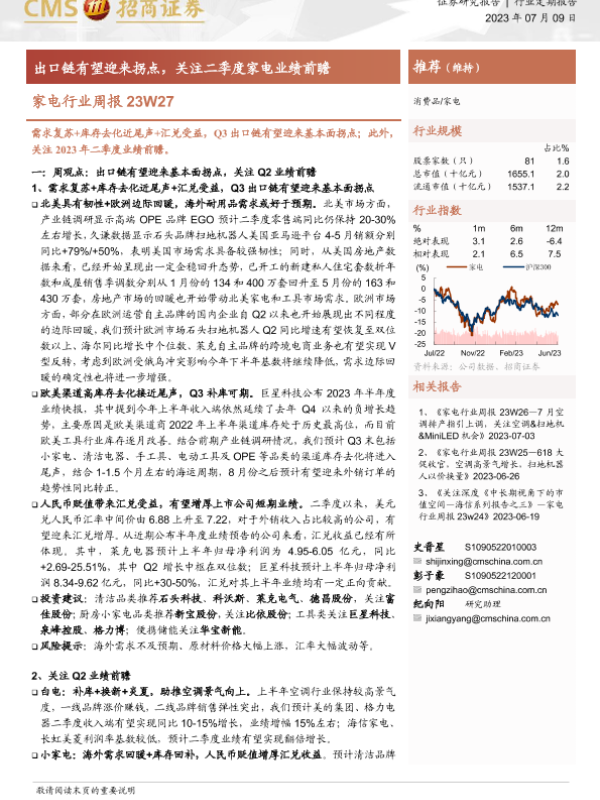 【海通证券】【20230709】家电行业周报23W27:出口链有望迎来拐点,关注二季度家电业绩前瞻-14页 行业研究