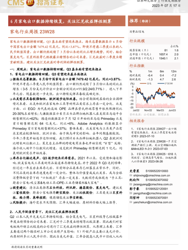 【海通证券】【20230717】20230717-招商证券-家电行业周报23W28:6月家电出口数据持续恢复,关注汇兑收益弹性测算-14页 行业研究