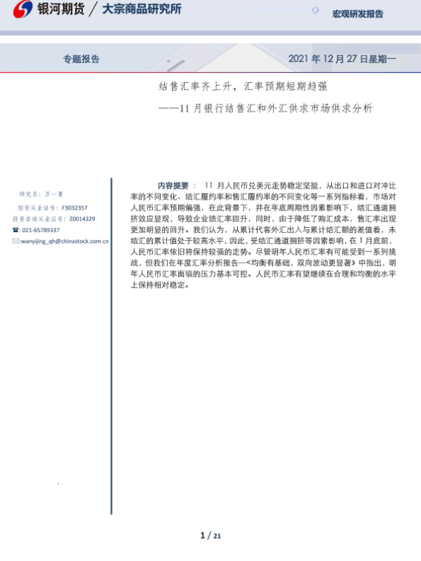 【银河期货】【20211227】11月银行结售汇和外汇供求市场供求分析:结售汇率齐上升,汇率预期短期趋强-21页 行业研究