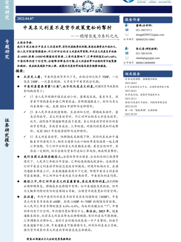 【国泰君安证券】【20220407】稳增长发力系列之九:中美名义利差不是货币政策宽松的掣肘-22页 宏观策略