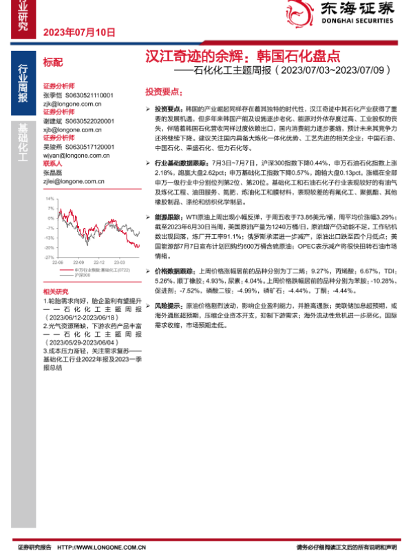 【东海证券】【20230710】20230710-东海证券-石化化工主题周报:汉江奇迹的余辉:韩国石化盘点-24页 行业研究