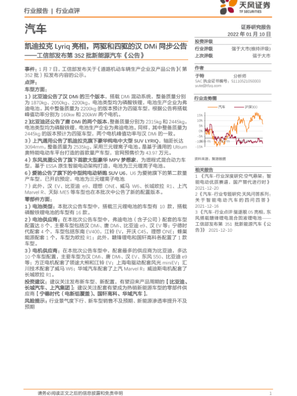 【天风证券】【20220110】工信部发布第352批新能源汽车《公告》:凯迪拉克Lyriq亮相,两驱和四驱的汉DMi同步公告-4页 行业研究