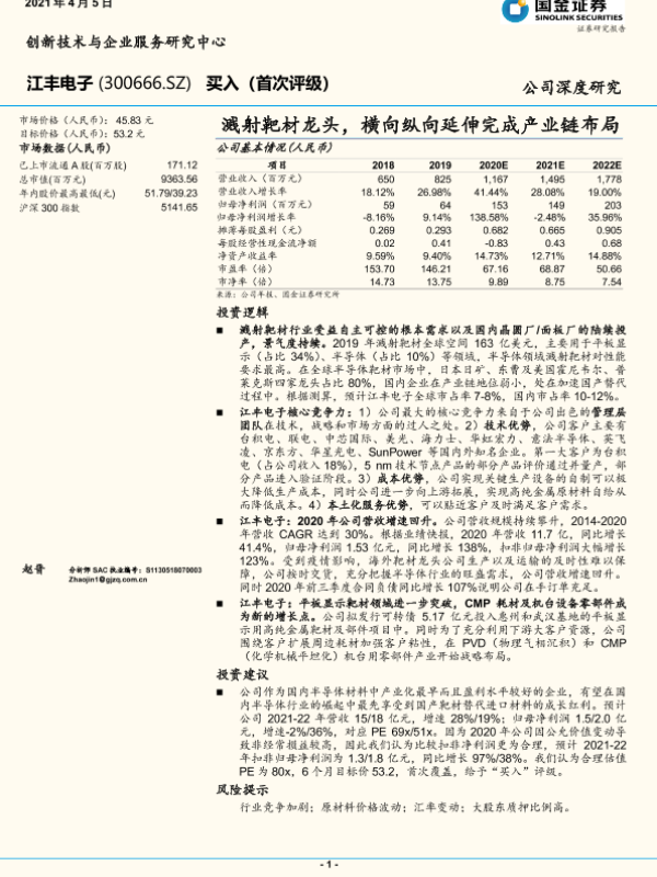 【国金证券】【20210405】20210405-国金证券-江丰电子-300666.SZ-溅射靶材龙头,横向纵向延伸完成产业链布局-22页 行业研究