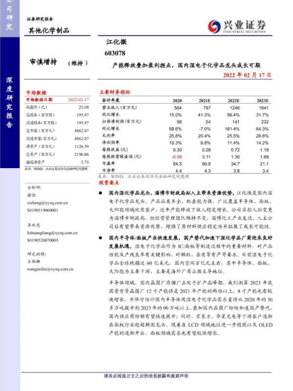 【兴业证券】【20220217】产能释放叠加盈利拐点,国内湿电子化学品龙头成长可期-26页 行业研究