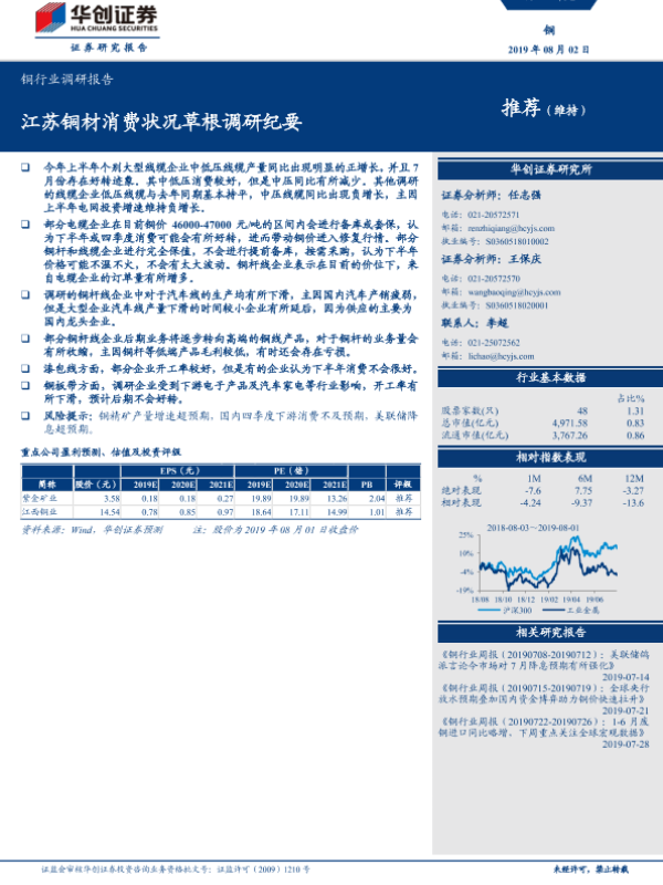 【华创证券】【20190802】20190802-华创证券-铜行业调研报告:江苏铜材消费状况草根调研纪要-10页 行业研究