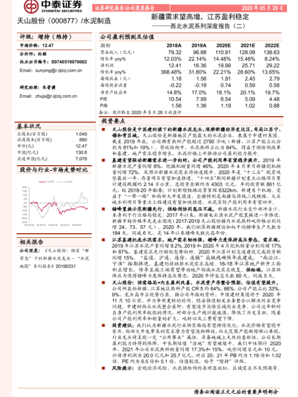 【中泰证券】【20200529】20200529-中泰证券-天山股份-000877.SZ-西北水泥系列深度报告(二):新疆需求望高增,江苏盈利稳定-32页 行业研究