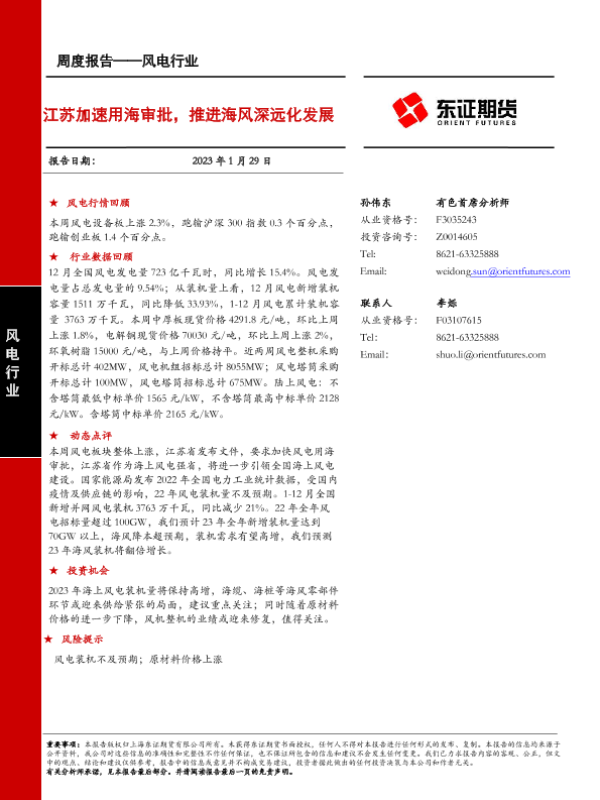 【东证期货】【20230129】风电行业周度报告:江苏加速用海审批,推进海风深远化发展-15页 行业研究