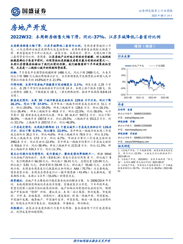 【国盛证券】【20220814】2022W32:本周新房销售大幅下滑,同比-37%,江苏多城降低二套首付比例-14页 行业研究