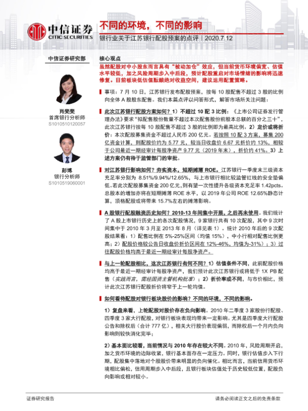 【中信证券】【20200712】关于江苏银行配股预案的点评:不同的环境,不同的影响-6页 行业研究