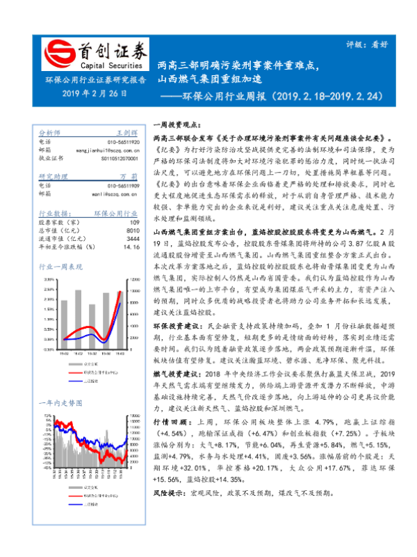 【首创证券】【20190226】环保公用行业周报:两高三部明确污染刑事案件重难点,山西燃气集团重组加速-13页 行业研究