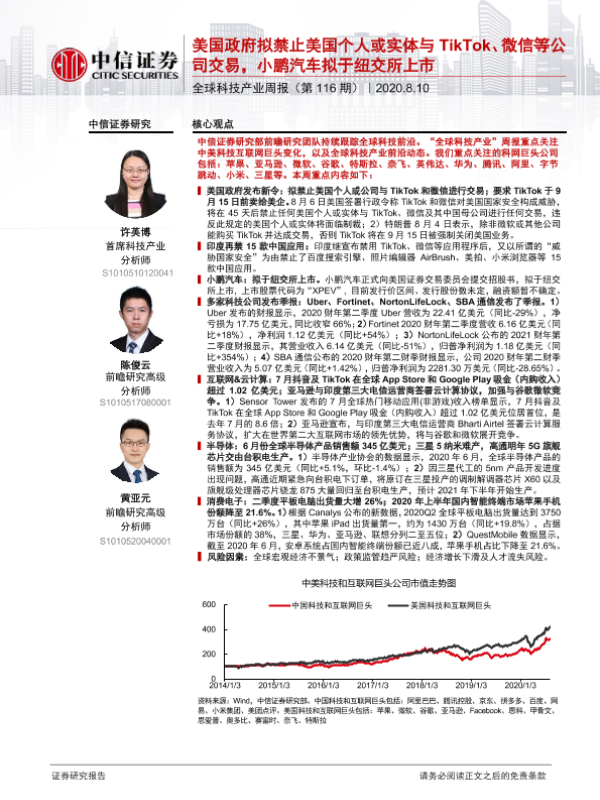 【中信证券】【20200810】全球科技产业周报(第116期):美国政府拟禁止美国个人或实体与TikTok、微信等公司交易,小鹏汽车拟于纽交所上市-30页 行业研究