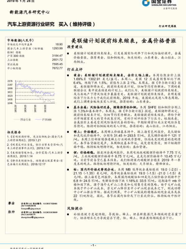 【国金证券】【20190128】汽车上游资源行业研究周报:美联储计划提前结束缩表,金属价格普涨-8页 行业研究