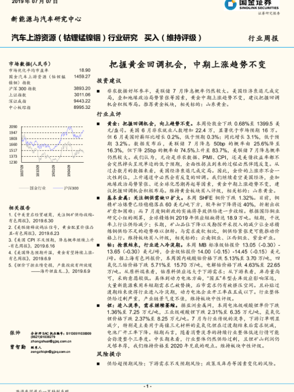 【国金证券】【20190707】20190707-国金证券-汽车上游资源(钴锂锰镍铟)行业研究:把握黄金回调机会,中期上涨趋势不变-8页 行业研究
