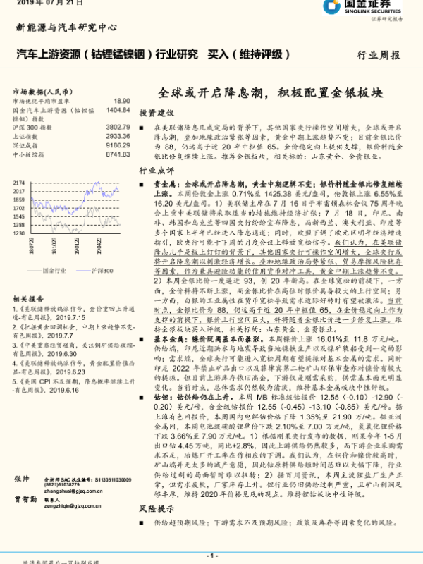 【国金证券】【20190721】汽车上游资源(钴锂锰镍铟)行业研究:全球或开启降息潮,积极配置金银板块-8页 行业研究