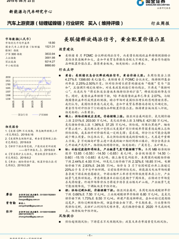 【国金证券】【20190623】20190623-国金证券-汽车上游资源行业周报:美联储释放鸽派信号,黄金配置价值凸显-8页 行业研究
