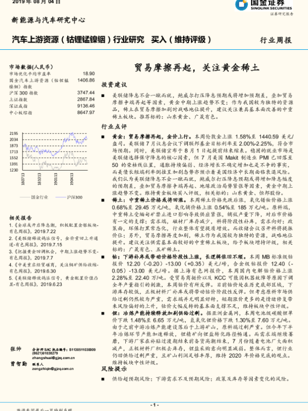 【国金证券】【20190804】20190804-国金证券-汽车上游资源(钴锂锰镍铟)行业研究:贸易摩擦再起,关注黄金稀土-8页 行业研究