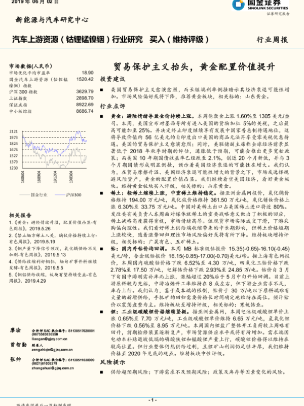 【国金证券】【20190602】汽车上游资源(钴锂锰镍铟)行业研究:贸易保护主义抬头,黄金配置价值提升-9页 行业研究