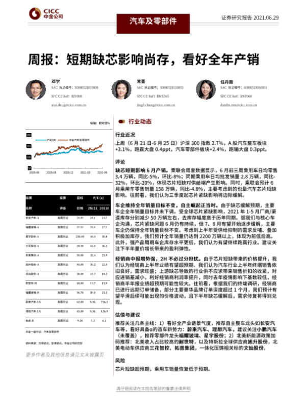 【中金公司】【20210629】汽车及零部件周报:短期缺芯影响尚存,看好全年产销-16页 行业研究