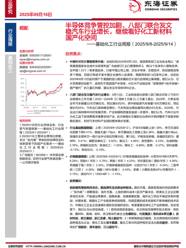 【东海证券】【202509】半导体竞争管控加剧、八部门联合发文 稳汽车行业增长,继续看好化工新材料 国产化空间-21页 证券期货研究报告