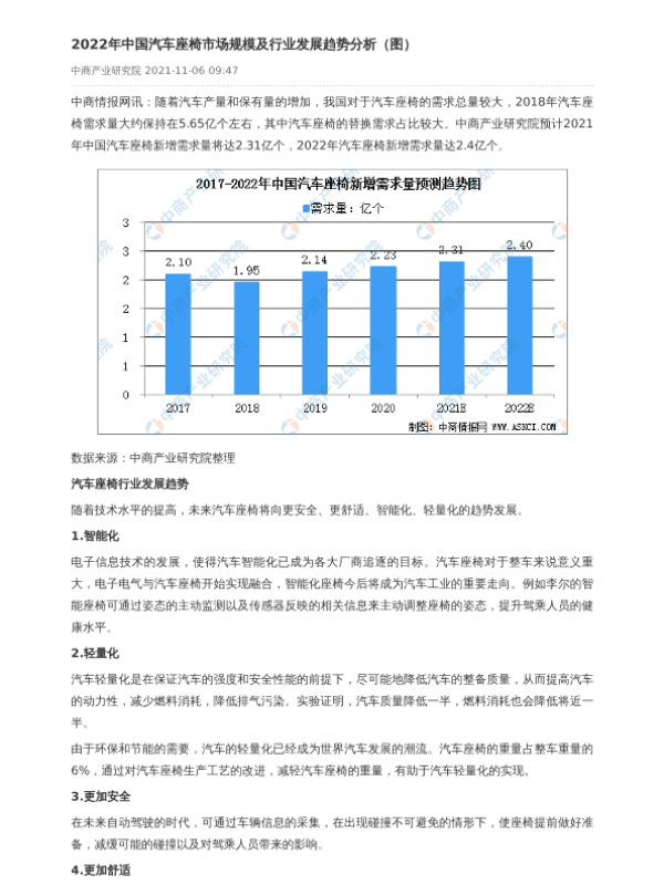 【中商产业研究院】【20211106】2022年中国汽车座椅市场规模及行业发展趋势分析-2页 行业研究