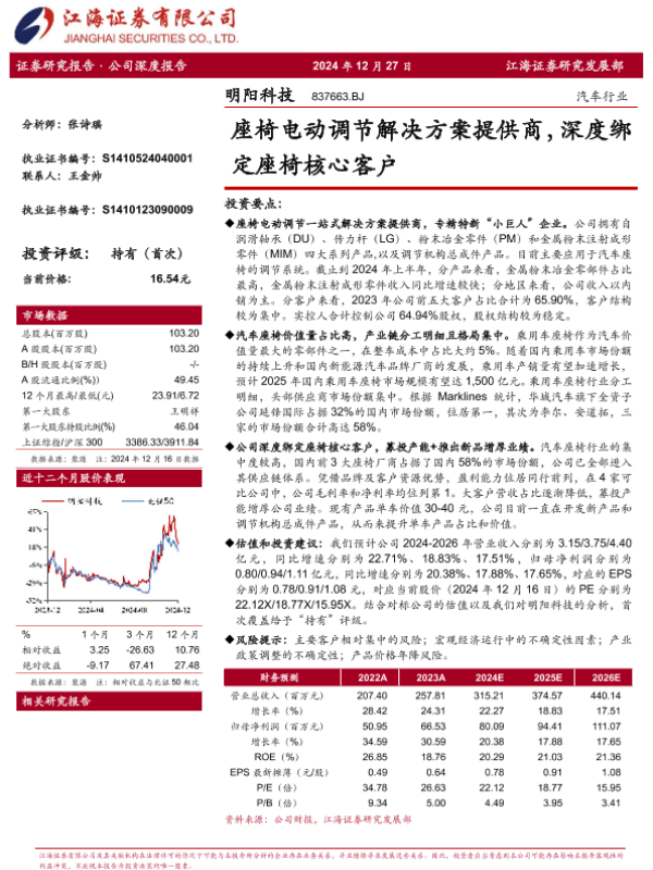 【东吴证券】【202508】明阳科技(837663):国内汽车座椅核心零部件供应商,智能化浪潮与产品结构优化增长可期-24页 证券期货研究报告