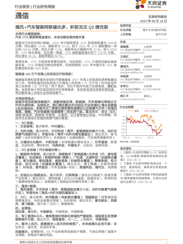 【天风证券】【20220618】通信行业研究周报:海风+汽车智能网联催化多,积极关注Q2绩优股-12页 行业研究