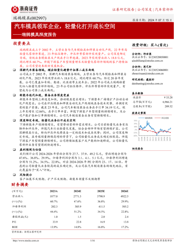 【浙商证券】【20240715】瑞鹄模具(002997)深度报告:汽车模具领军企业,轻量化打开成长空间-16页 行业研究