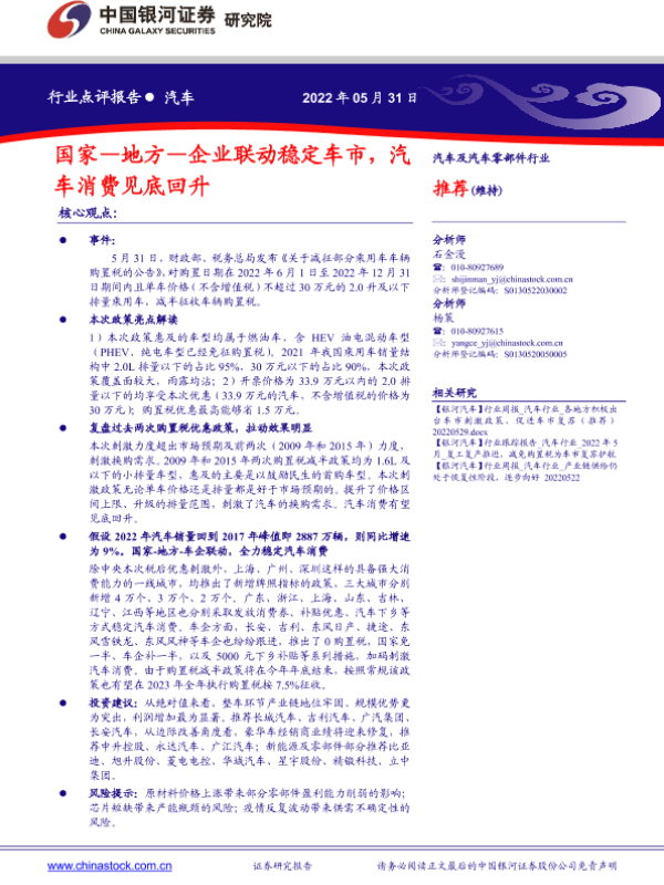【银河证券】【20220531】国家—地方—企业联动稳定车市,汽车消费见底回升-2页 行业研究