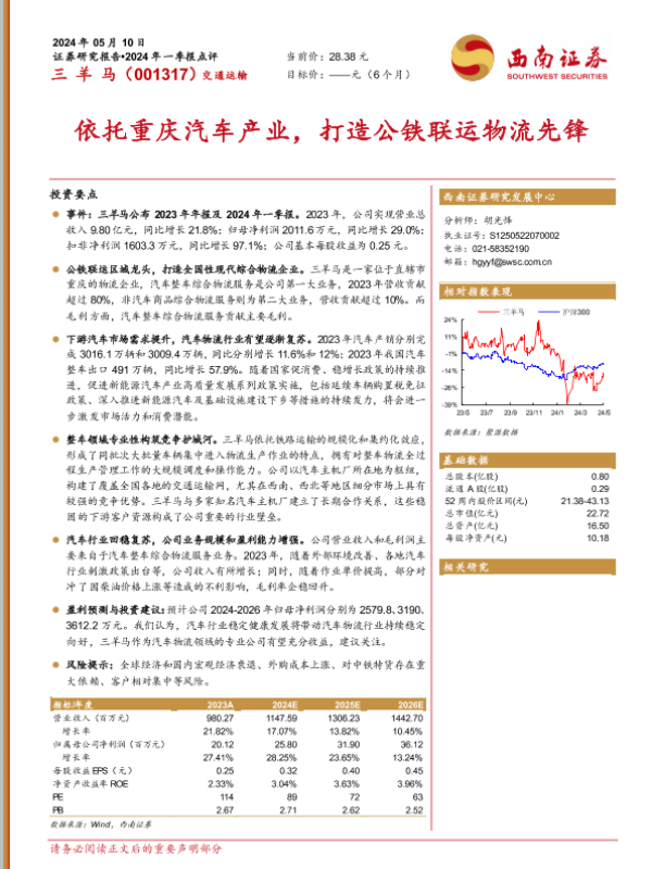 【西南证券】【20240510】三羊马-001317.SZ-依托重庆汽车产业,打造公铁联运物流先锋-31页 行业研究