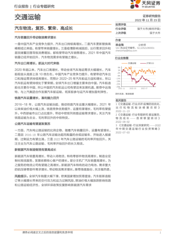 【天风证券】【20221123】交通运输:汽车物流:复苏、繁荣、高成长-23页 行业研究