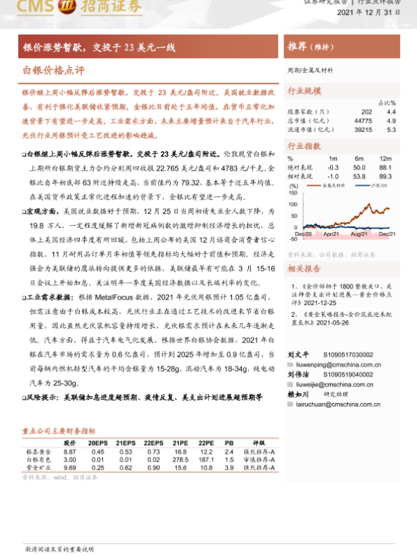 【海通证券】【20211231】白银价格点评:银价涨势暂歇,交投于23美元一线-3页 证券期货研究报告