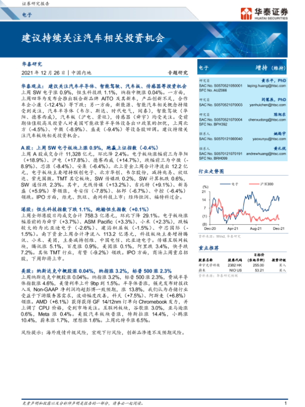 【华泰证券】【20211226】电子行业专题研究:建议持续关注汽车相关投资机会-16页 行业研究