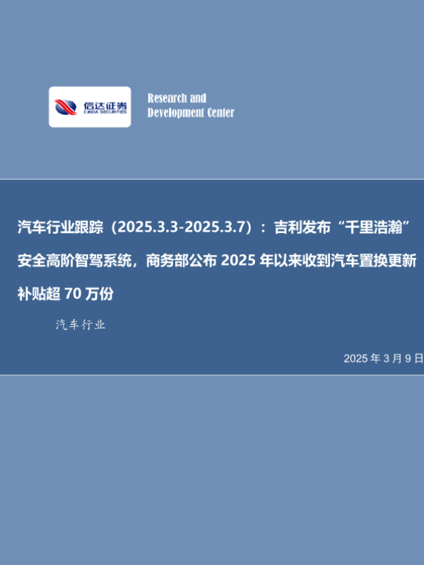 【信达证券】【20250309】汽车行业跟踪(2025.3.3-2025.3.7):吉利发布“千里浩瀚”安全高阶智驾系统,商务部公布2025年以来收到汽车置换更新补贴超70万份-12页 行业研究
