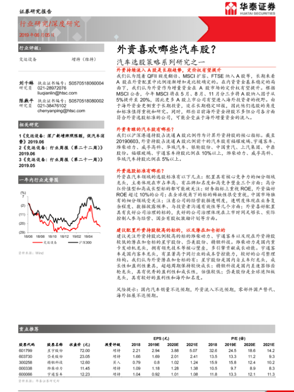 【华泰证券】【20190605】汽车选股策略系列研究之一:外资喜欢哪些汽车股?-18页 行业研究