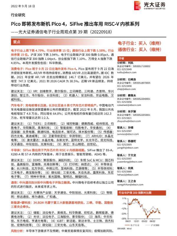 【光大证券】【20220918】20220918-光大证券-通信电子行业周观点第39期:Pico即将发布新机Pico4,SiFive推出车用RISC-V内核系列-14页 行业研究