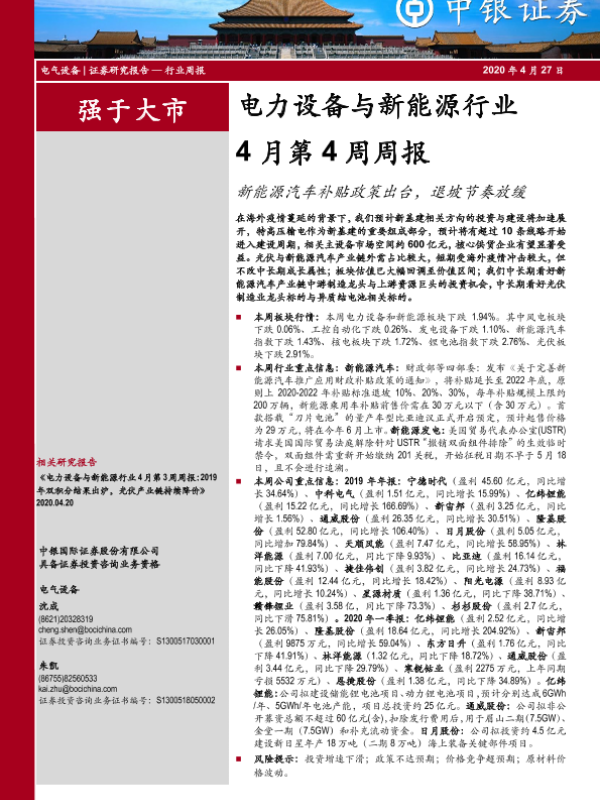 【中银证券】【20200427】电力设备与新能源行业4月第4周周报:新能源汽车补贴政策出台,退坡节奏放缓-19页 行业研究