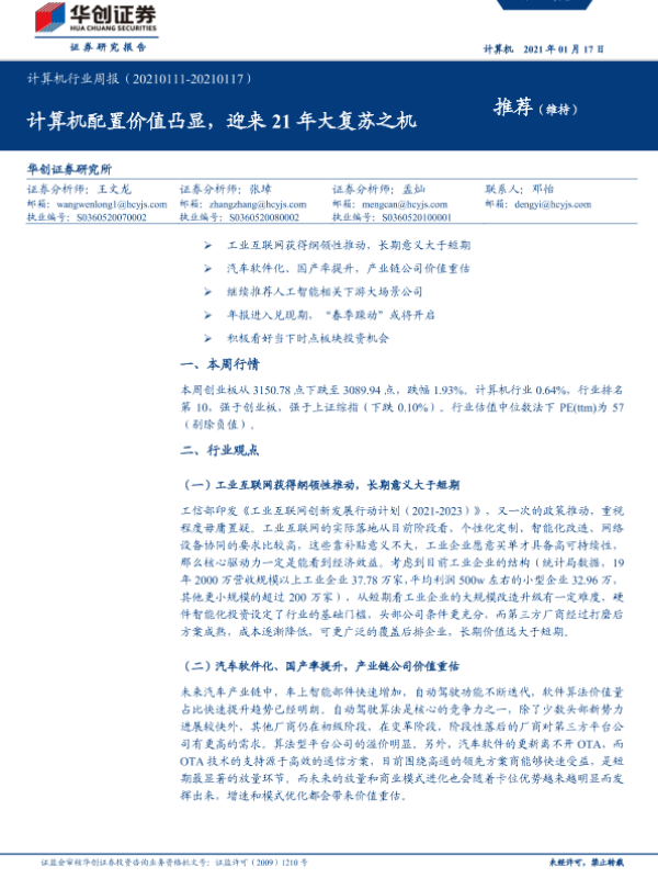 【华创证券】【20210117】计算机行业周报:计算机配置价值凸显,迎来21年大复苏之机-5页 行业研究