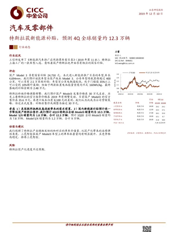 【中金公司】【20191210】汽车及零部件:特斯拉获新能源补贴,预测4Q全球销量约12.3万辆-7页 行业研究