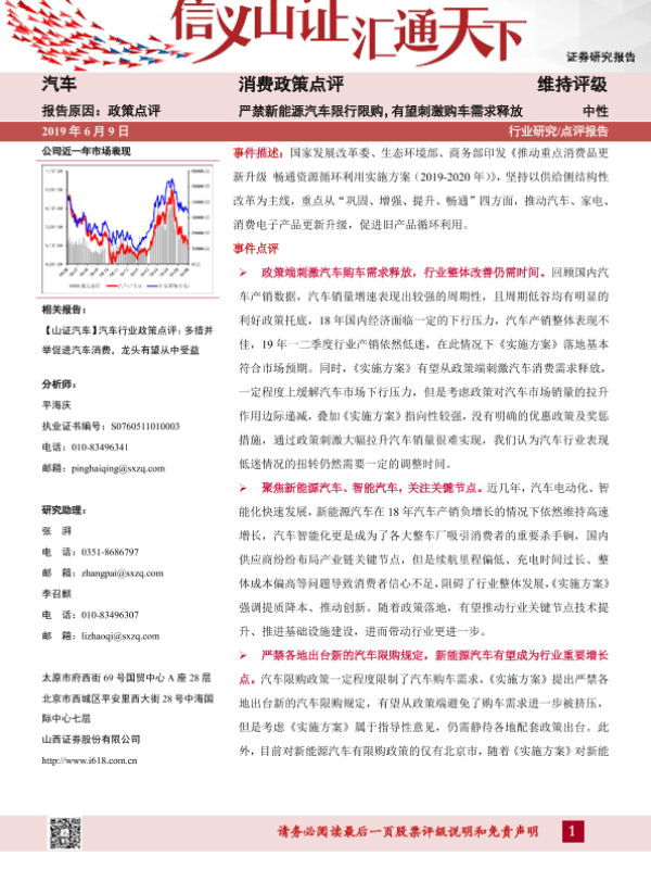 【山西证券】【20190609】汽车:消费政策点评:严禁新能源汽车限行限购,有望刺激购车需求释放-20页 行业研究