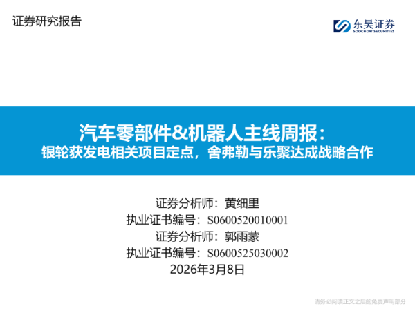 【东吴证券】【202603】汽车零部件&机器人主线周报:银轮获发电相关项目定点,舍弗勒与乐聚达成战略合作-23页 证券期货研究报告