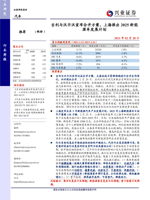【兴业证券】【20210228】20210228-兴业证券-汽车行业周报:吉利与沃尔沃宣布合并方案,上海推出2025新能源车发展计划-24页 行业研究