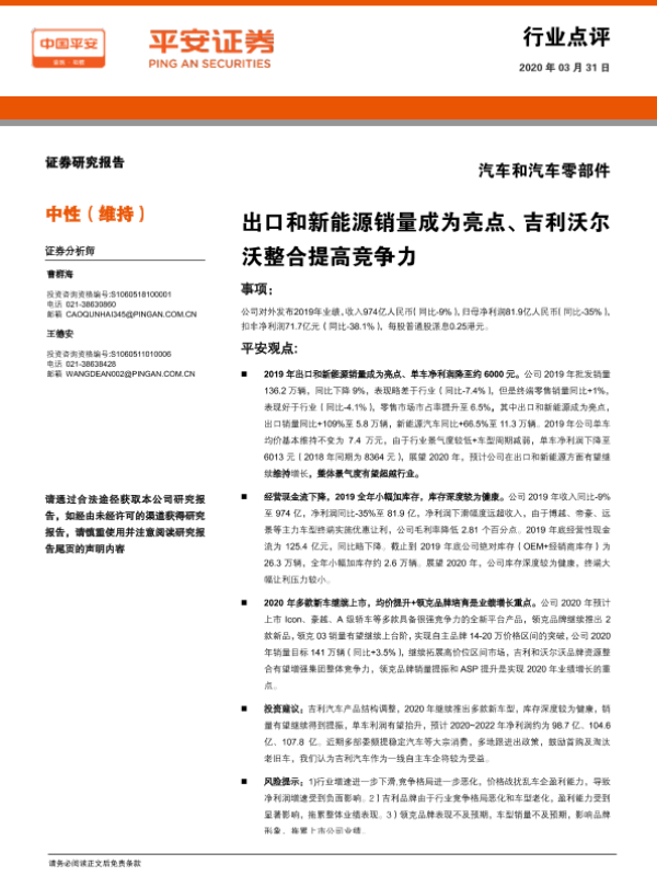 【平安证券】【20200331】汽车和汽车零部件行业点评:出口和新能源销量成为亮点、吉利沃尔沃整合提高竞争力-4页 行业研究