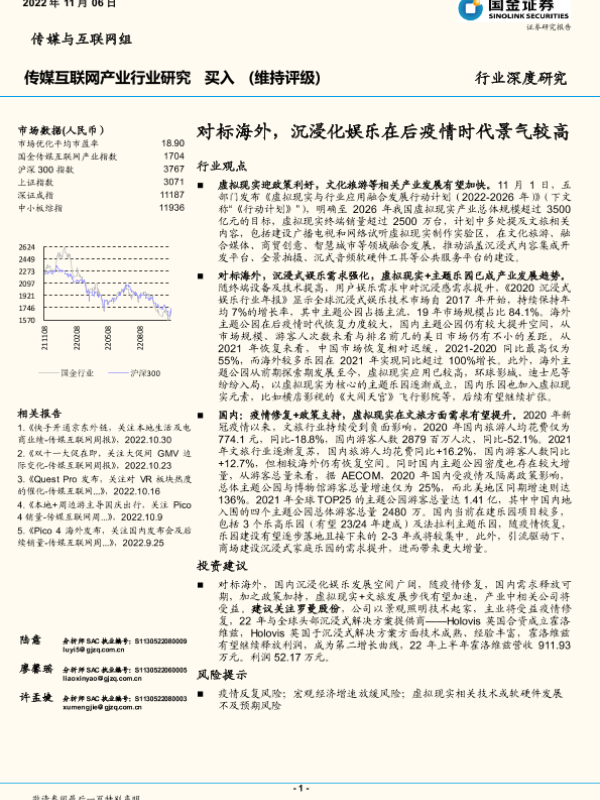 【国金证券】【20221106】传媒互联网产业行业研究:对标海外,沉浸化娱乐在后疫情时代景气较高-24页 行业研究