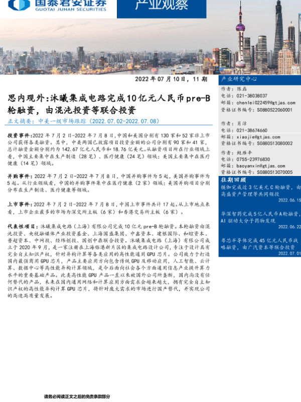 【国泰君安证券】【20220710】产业观察11期:思内观外,沐曦集成电路完成10亿元人民币pre_B轮融资,由混沌投资等联合投资-22页 行业研究