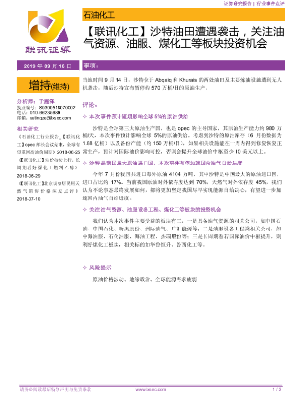 【粤开证券】【20190916】沙特油田遭遇袭击,关注油气资源、油服、煤化工等板块投资机会-3页 证券期货研究报告