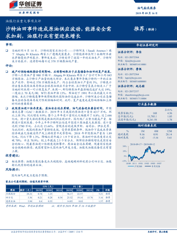 【华创证券】【20190916】油服行业重大事项点评:沙特油田事件造成原油供应波动,能源安全需求加剧,油服行业有望迎来增长-4页 行业研究
