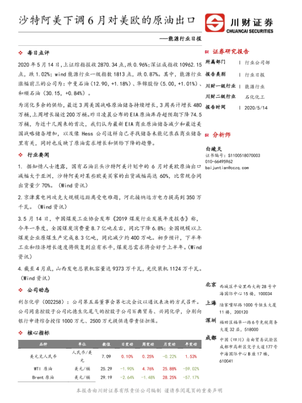 【川财证券】【20200514】能源行业日报:沙特阿美下调6月对美欧的原油出口-3页 证券期货研究报告