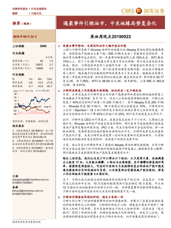 【海通证券】【20190922】原油周观点:遇袭事件引燃油市,中东地缘局势复杂化-19页 证券期货研究报告