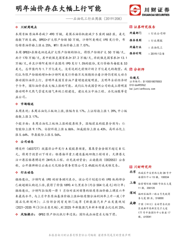 【川财证券】【20191208】石油化工行业周报:明年油价存在大幅上行可能-11页 证券期货研究报告